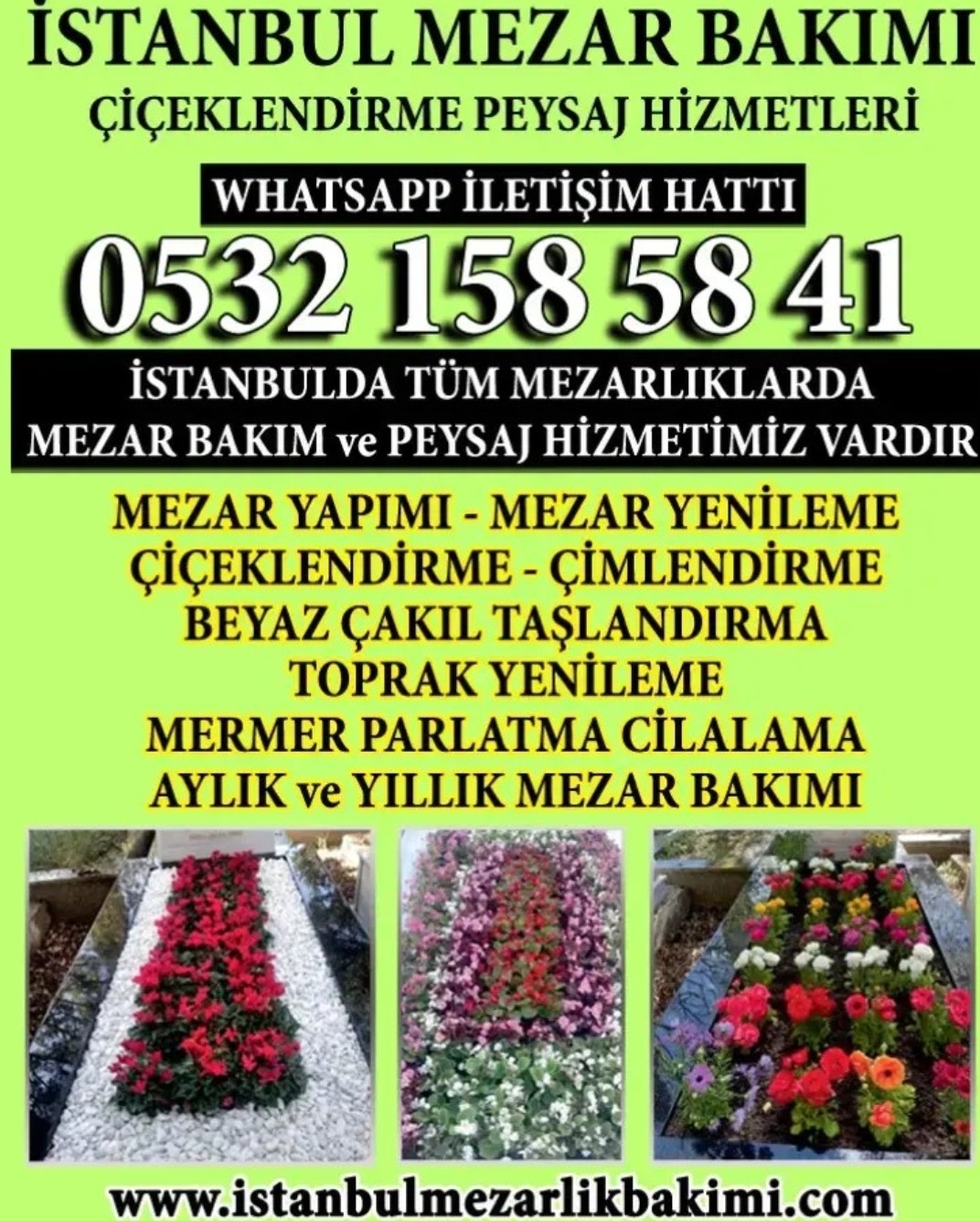 Profesyonel ve alanında uzman ekibimizle müşterilerimizin isteklerini ve memnuniyetlerini ön planda tutan, profesyonelce çalışan firmamız çok kısa zamanda İstanbul’un ve hatta çevre illerin tüm mezar bakım, çiçeklendirme ve peyzaj çalışmalarında sektöre yön veren firma olmuştur.